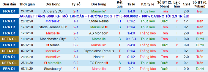 - Thống kê 10 trận gần nhất của Marseille