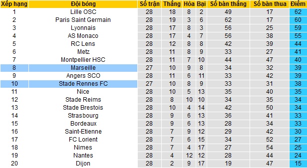 Marseille vẫn đang thi đấu khá tệ trong thời gian gần đây và hiện đã tụt xuống vị trí thứ 8 trên bảng xếp hạng của Ligue 1. Với 39 điểm có được sau 27 vòng đấu, khoảng cách của đội bóng với Top 5 hiện đã là 5 điểm mặc dù Marseille đang thi đấu ít hơn 1 trận.