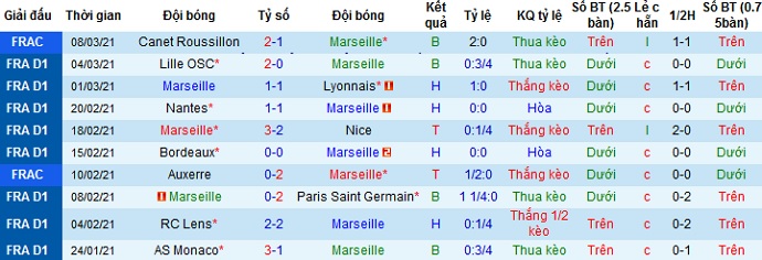 + Thống kê 10 trận gần nhất của Marseille
