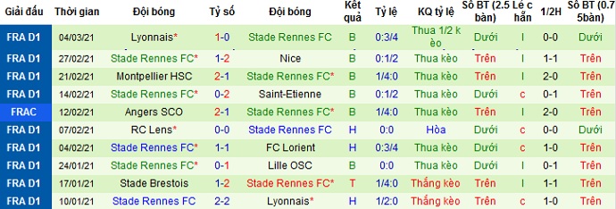 + Thống kê 10 trận gần nhất của Rennes