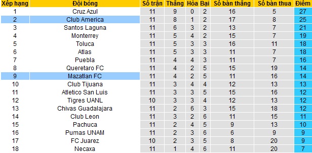 Trong khi đó Club América đã vươn lên vị trí thứ nhì trên bảng xếp hạng với 25 điểm sau 11 vòng đấu. Hiện Club América đang kém đội đầu bảng Cruz Azul 2 điểm đồng thời đang hơn đội thứ ba Santos Laguna tới 4 điểm.