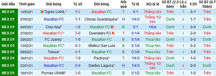 + Thống kê 10 trận gần nhất của Mazatlán FC