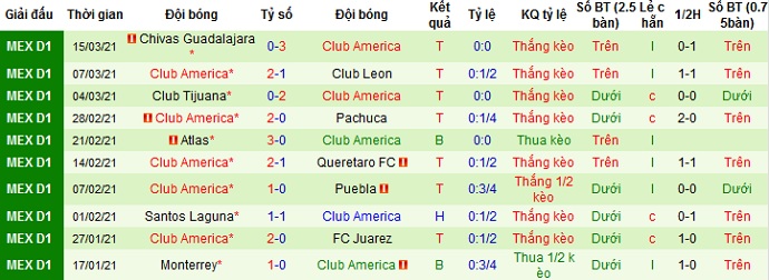 + Thống kê 10 trận gần nhất của Club América
