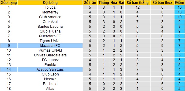 Bảng xếp hạng giải VĐQG Mexico trước vòng 6