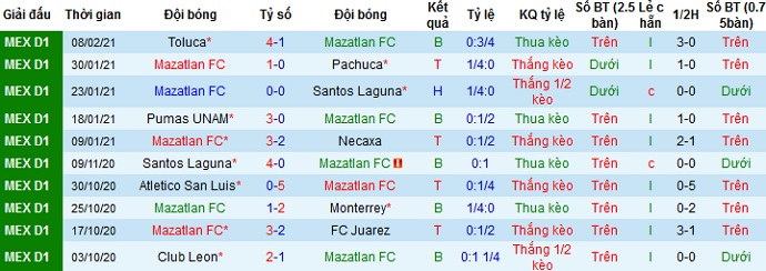 + Thống kê 10 trận gần nhất của Mazatlán FC