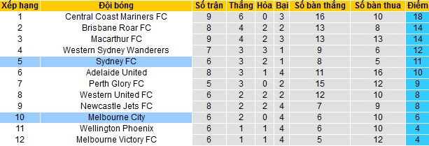 Bảng xếp hạng giải VĐQG Úc vòng 9