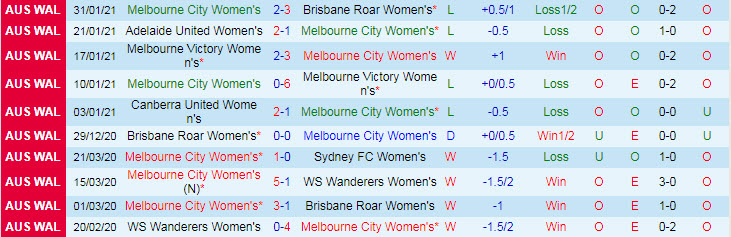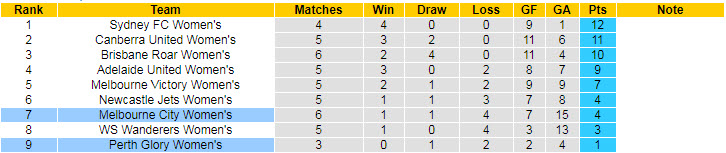 Melbourne City (W) cần nhớ họ đang sở hữu phong độ thất thường, chẳng hơn đối thủ là bao. Sau 6 lượt trận, những gì các cô gái tới từ thành phố cảng Melbourne City chỉ thắng 1 trận, hòa 1 và thua tới 4 lần. Lúc này, họ chỉ đứng trên Perth Glory (W) và Western Sydney Wanderers (W) trên bảng tổng sắp.