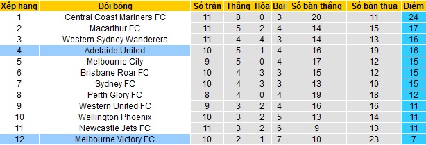 Bảng xếp hạng giải VĐQG Úc trước vòng 12