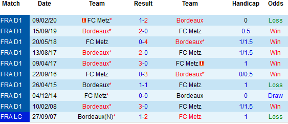 + Lịch sử đối đầu Metz vs Bordeaux: