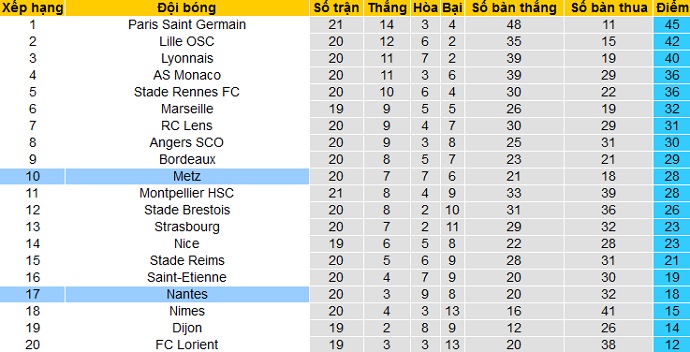 Trong khi đó Nantes đã tụt xuống vị trí thứ 17 trên bảng xếp hạng, ngay trên nhóm các đội cầm đèn đỏ. Với 18 điểm có được sau 20 vòng đấu, Nantes vẫn đang hơn đội thứ 18 Nimes 3 điểm và hơn đội bét bảng Lorient tới 6 điểm.