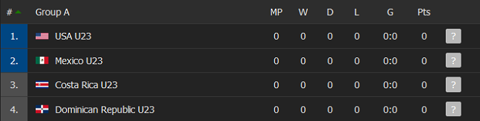 Hai vị trí đi tiếp của bảng A được xem là cuộc cạnh tranh của 3 đội: Mexico U23, Costa Rica U23 và Mỹ U23. CH Domenican U23 dĩ nhiên là đội bị đánh giá thấp nhất.