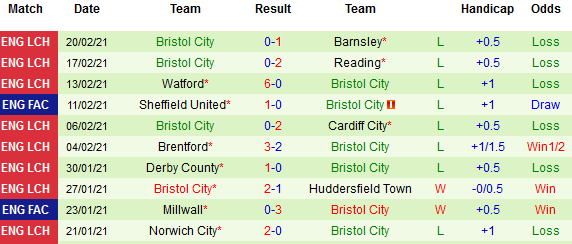 + Thống kê 10 trận gần nhất của Bristol City