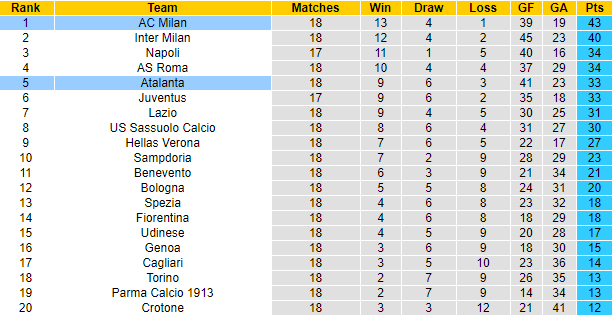 Milan vẫn đang dẫn đầu bảng xếp hạng Serie A 2020/21. Sau 18 vòng đấu đội bóng áo đỏ thành Milano đã giành được 43 điểm, hơn đội xếp thứ 2 Inter Milan 3 điểm. Trong khi đó Atalanta mới giành được 33 điểm sau 18 trận, xếp ở vị trí thứ 5 trên bảng xếp hạng.