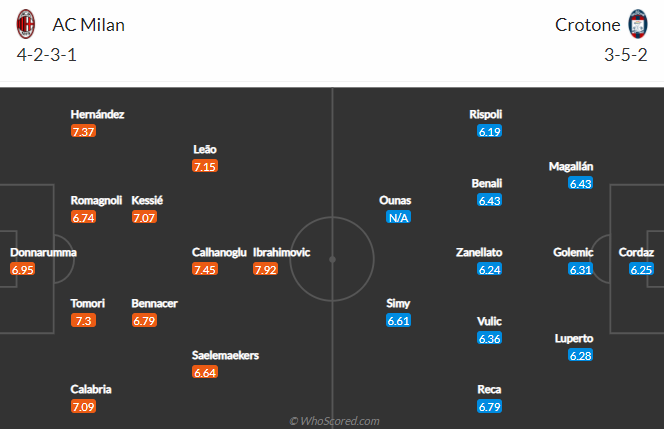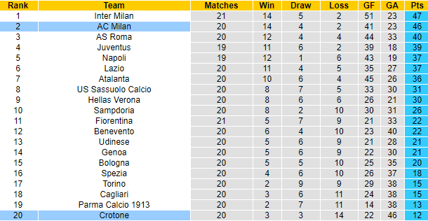 Tuy nhiên ở trận đấu sắp tới, Milan vẫn được tin tưởng vào khả năng giành chiến thắng thuyết phục. Bởi đối thủ của họ chỉ là đội bét bảng Crotone. Sau 20 vòng đấu tại Serie A mùa này, Crotone mới giành được 12 điểm, ghi 22 bàn, thủng lưới 46 lần.
