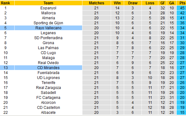 Nhưng sự chuẩn bị của Mirandes rất đáng lo ngại khi đội bóng này mới thắng được duy nhất 1 trận trong 7 lần ra sân gần nhất. Trong khi đó, Vallecano đang tăng tốc với 7 trận gần đây đều bất bại, trong đó có 6 chiến thắng chung cuộc.