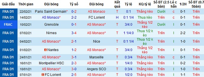 + Thống kê 10 trận gần nhất của Monaco