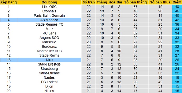Trái lại Nice chỉ đứng ở nửa dưới của bảng xếp hạng ở vị trí thứ 13 với 26 điểm sau 21 vòng đấu. Đây là thành tích có phần sa sút của đội bóng khi ở mùa trước Nice còn kết thúc giải đấu ở vị trí thứ 5. Tuy nhiên Nice vẫn đang hơn nhóm các đội trong nhóm cầm đèn đỏ tới 8 điểm.