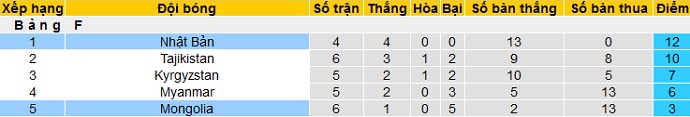Trái lại tuy mới thi đấu 4 trận nhưng Nhật Bản vẫn đang dẫn đầu bảng đấu với 12 điểm tuyệt đối, hơn đội thứ nhì Tajikistan 2 điểm nhưng thi đấu ít hơn 2 trận. Ngoài ra Nhật Bản cũng đang bỏ xa nhóm các đội còn lại tới 5 điểm.