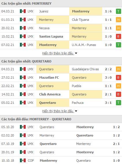 Phong độ và thống kê đối đầu gần đây Monterrey vs Queretaro: