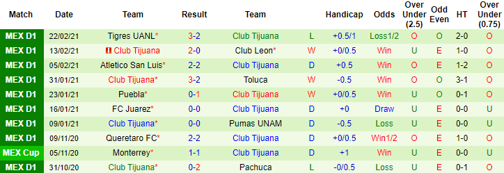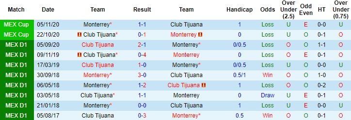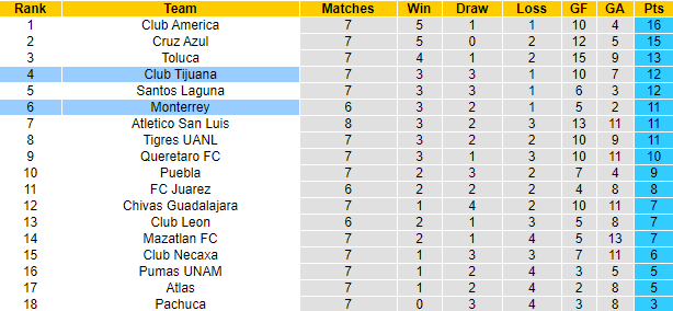 Tijuana đang xếp trên Monterrey 2 bậc ở bảng xếp hạng giải VĐQG Mexico mùa này. Theo đó, Tijuana xếp ở vị trí thứ 4 với 12 điểm, Monterrey xếp thứ 6 với 6 điểm. Thế nhưng ở trận đối đầu sắp tới, Monterrey lại được đánh giá cao vào khả năng giành chiến thắng.