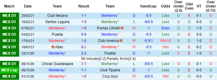 Trên sàn giao dịch châu Á, Monterrey chấp -3/4 theo handicap trước giờ bóng lăn. Mức chấp này rõ ràng đang hoàn toàn chống lại thực tế xếp hạng của hai đội. Monterrey đã và đang tạo được sự tin tưởng trên sân nhà, 5 lần tiếp khách gần đây tại giải VĐQG Mexico họ thắng 4, hoà 1 trận.