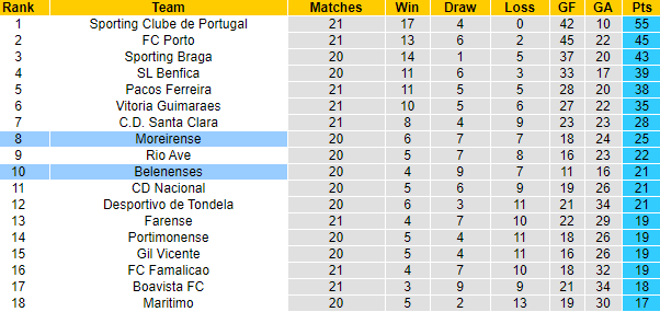 Cả Moreirense lẫn Belenenses đều không phải những đội bóng có thực lực ở Bồ Đào Nha, và mục tiêu đôi bên đặt ra cũng chỉ là trụ hạng. Đến thời điểm hiện tại, cả 2 đội đang có những thứ hạng an toàn. Moreirense đứng thứ 8 còn Belenenses xếp dưới 2 bậc.