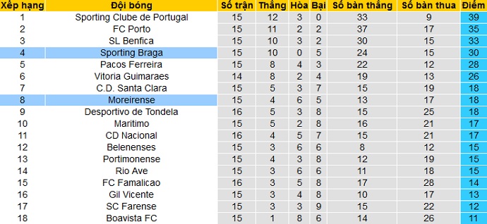 Trong khi đó Sporting Braga chỉ đang nằm trong nhóm các đội có suất dự Europa League ở vị trí thứ tư với 30 điểm sau 15 vòng đấu. Hiện tại Braga đang kém đội thứ ba Benfica 3 điểm nhưng bị đội đầu bảng Sporting Lisbon bỏ xa tới 9 điểm.
