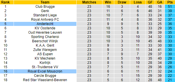 Với cách biệt như vậy, Mouscron hoàn toàn có thể tụt xuống vị trí cuối cùng nếu sảy chân 1, 2 trận. Phía bên đối diện, Anderlecht mùa này chơi không tốt. Họ hiện đứng thứ 5 trên BXH, bị đối thủ dẫn đầu bỏ cách rất xa. Ngay cả việc lọt vào top 4 với Anderlecht cũng trở nên khó khăn.