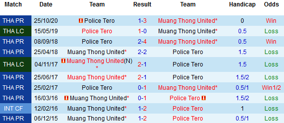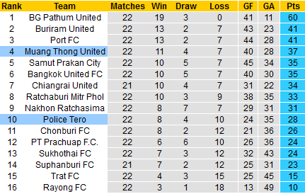 Trên sân khách là hình ảnh thất vọng của Police Tero khi họ vừa thua tới 4 trong 5 chuyến hành quân xa gần đây. Ở chiều ngược lại, Muang Thong vừa có tới 10 trong 11 trận gần nhất ở mọi giải đấu gần đây đều bất bại, trong đó giành chiến thắng 7 trận.