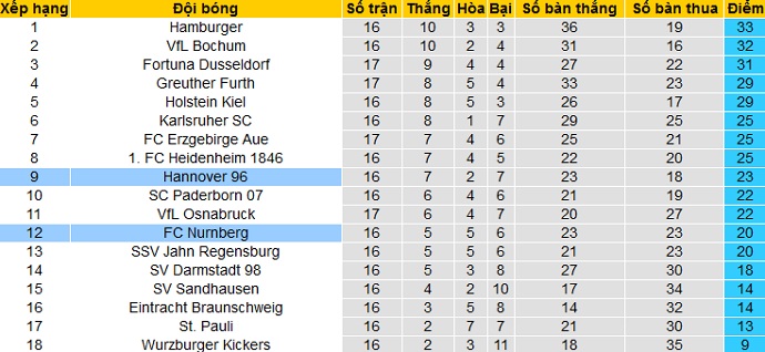 Trong khi đó Hannover đang đứng trên đối thủ 2 bậc với 23 điểm cũng sau 16 vòng đấu. Thế nhưng đây cũng là thành tích rất tệ nếu so với vị trí thứ 6 của đội bóng ở mùa giải trước. Hiện Hannover vẫn đang kém các đội Top 3 tới 8 điểm.