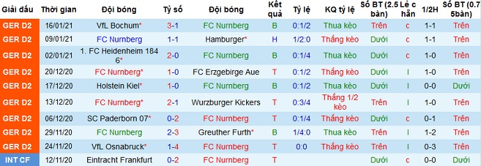 Trong 5 trận gần đây Nürnberg chỉ có được 1 trận thắng, 1 trận hòa và để thua 3 trận. Tuy nhiên trên sân nhà thành tích của Nürnberg vẫn đang khá tốt với 2 trận thắng, 2 trận hòa và chỉ để thua 1 trận ở 5 trận gần nhất tại đây.