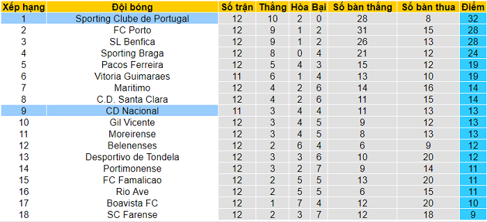 Bảng xếp hạng giải VĐQG Bồ Đào Nha sau vòng 12