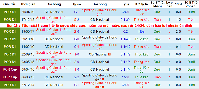 Trên sân khách, Sporting Lisbon là đội có tỷ lệ thắng kèo lớn thứ 2 tại giải VĐQG Bồ Đào Nha mùa này. Tỷ lệ thắng kèo sân khách của họ đạt 66.67%, chỉ sau Vitoria de Guimaraes. Trong khi đó, tỷ lệ thắng kèo trên sân nhà của Nacional Madeira chỉ là 33.33%: thắng 2, hòa 2, thua 2.