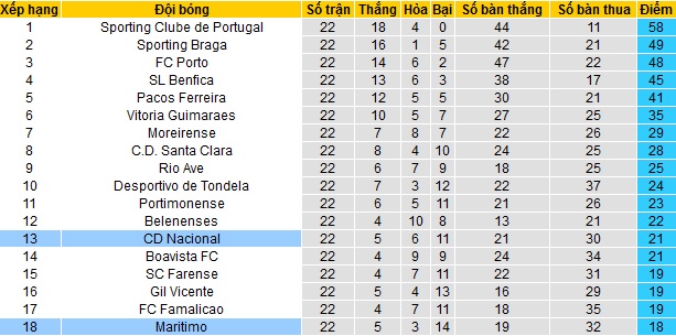 Trong khi đó Marítimo vẫn đang đứng bét bảng xếp hạng khi mới chỉ có được 18 điểm sau 22 vòng đấu. Tuy nhiên hiện Marítimo cũng chỉ kém 2 đội đứng ngay trên cũng như cách nhóm các đội trụ hạng đúng 1 điểm nên cơ hội hầu như còn nguyên cho tất cả các đội.
