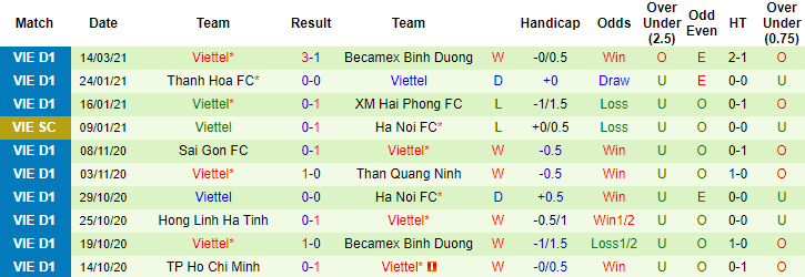 + Thống kê 10 trận gần nhất của Viettel