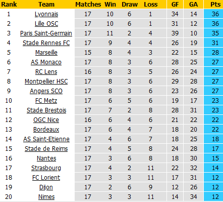 BẢNG XẾP HẠNG Ligue 1