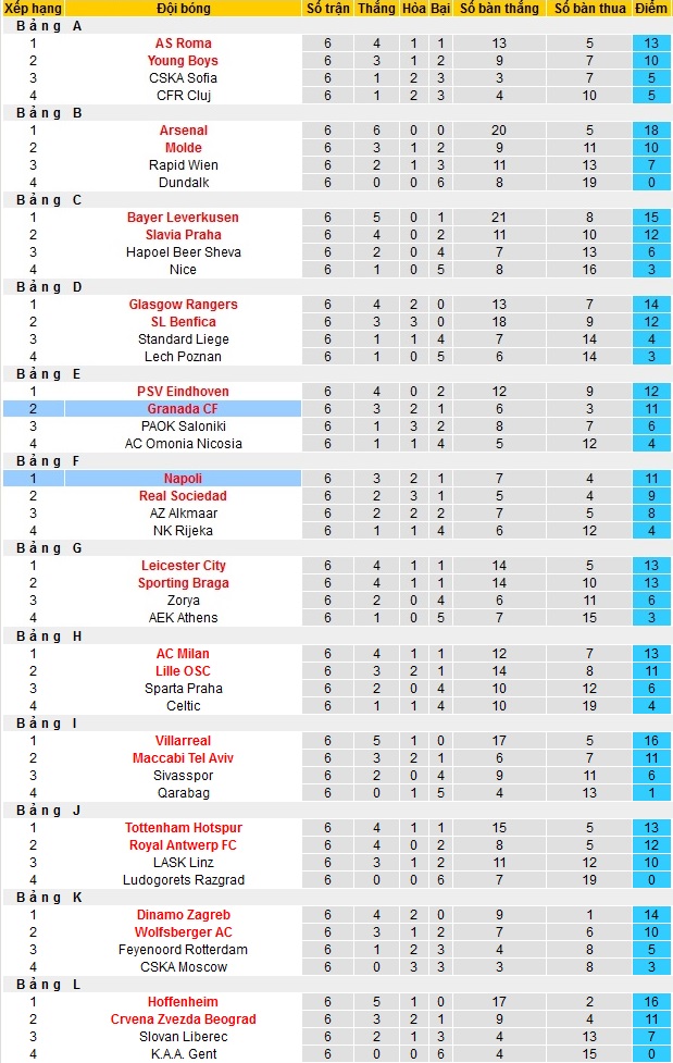 Bảng xếp hạng Europa League giai đoạn vòng bảng