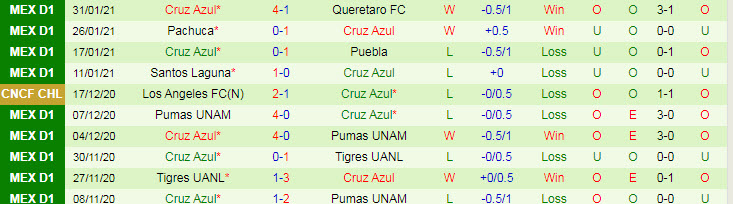 + Thống kê 10 trận gần nhất của Cruz Azul