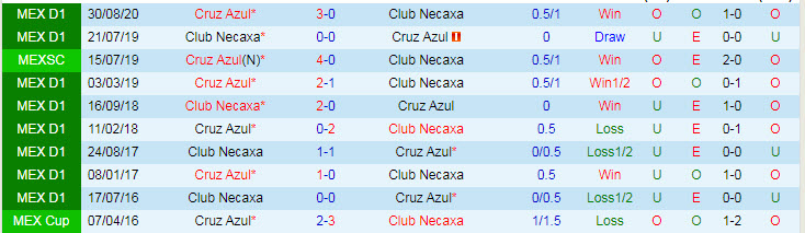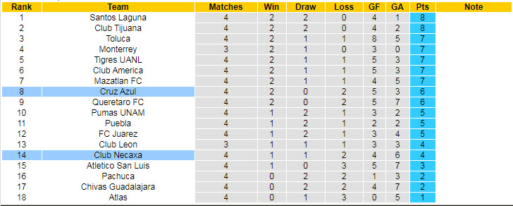 Phong độ và thống kê đối đầu Necaxa - Cruz Azul gần đây: