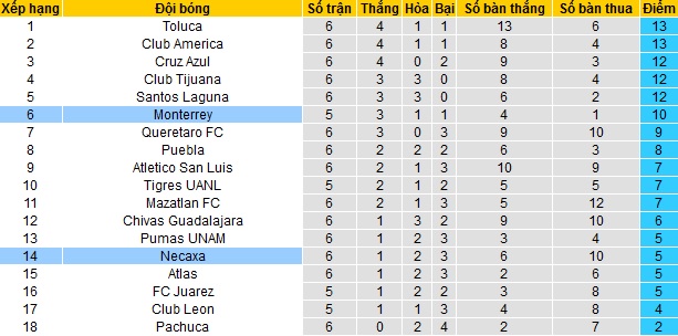 Trong khi đó Monterrey đang đứng thứ sáu trên bảng xếp hạng khi có được 10 đểm nhưng mới thi đấu 5 trận. Hiện tại Monterrey kém các đội trong Top 4 là 2 điểm và kém 2 đội đầu bảng là 3 điểm nhưng thi đấu ít hơn 1 trận.