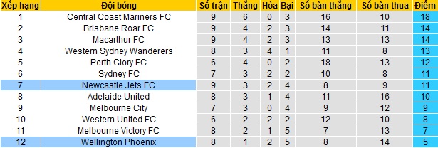 Newcastle Jets hiện đang đứng thứ 9 trên bảng xếp hạng của giải vô địch quốc gia Úc. Với 11 điểm sau 9 vòng đấu, Newcastle Jets đang có bằng điểm với hai đội xếp ngay trên nhưng kém về hiệu số bàn thắng và đã thi đấu nhiều hơn 2 trận. Tuy nhiên khoảng cách đến các đội Top 6 cũng đang chỉ là 1 điểm.