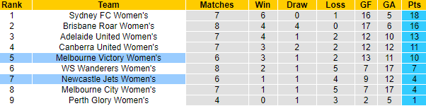 Sau 6 trận đã đấu, Newcastle Jets (W) mới có 4 điểm và chỉ thắng được 1 trận. Với những gì đã thể hiện, rất khó để Newcastle Jets (W) có thể vươn lên cạnh tranh vị trí trong top 4 để có mặt tại giai đoạn Final. Nếu như Newcastle Jets (W) chơi thiếu ổn định thì đối thủ của họ lại có phong độ tốt hơn hẳn.