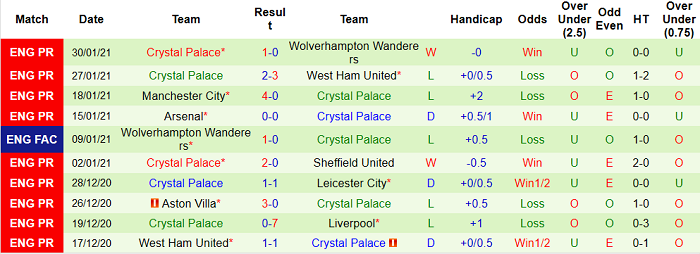 - Thống kê 10 trận gần nhất của Crystal Palace