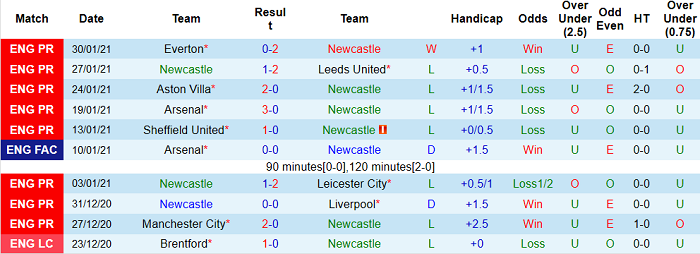 - Thống kê 10 trận gần nhất của Newcastle