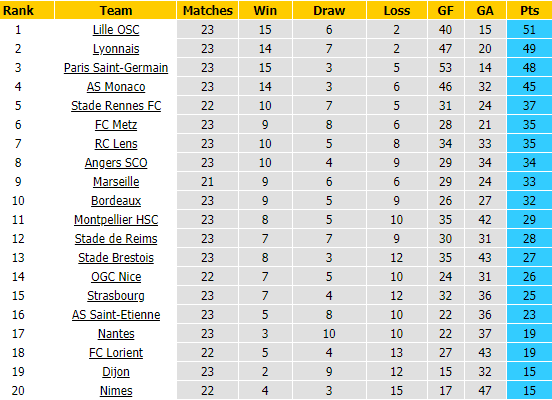 BẢNG XẾP HẠNG GIẢI VĐQG PHÁP