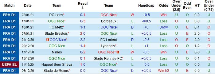 - Thống kê 10 trận gần nhất của Nice