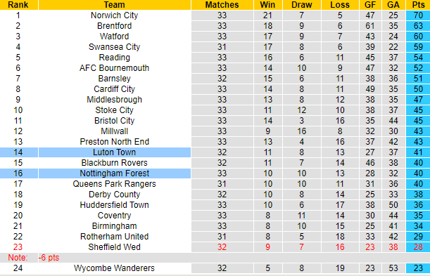 Điều đó cho thấy rằng giới chuyên môn đặt niềm tin vào khả năng giành điểm của đội khách trong 90 phút tranh tài sắp tới. Luton Town xứng đáng nhận được sự tin tưởng khi lúc này thành tích của họ thậm chí đang tốt hơn đối thủ. Sau 32 vòng đấu, Luton Town giành 41 điểm, xếp thứ 14 trên bảng xếp hạng. Trong khi đó sau 33 trận, Nottingham Forest mới giành được 40 điểm, xếp ở vị trí thứ 16.