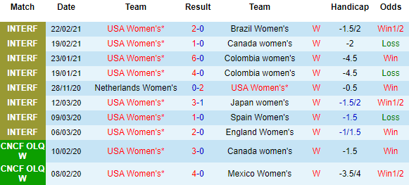 + Thống kê 10 trận gần nhất của Nữ Mỹ