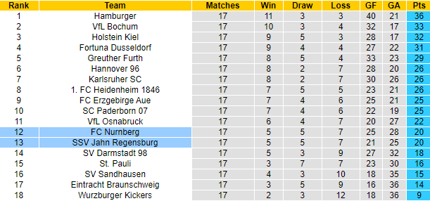 Nurnberg và Jahn Regensburg cùng giành được 20 điểm sau 17 vòng đấu tại giải hạng 2 Đức mùa này, chia sẻ 2 vị trí thứ 12 và 13 trên bảng xếp hạng. Với lợi thế sân nhà, Nurnberg tất nhiên xứng đáng được xếp cửa trên trước giờ bóng lăn. Tuy nhiên điều đó lại khiến họ bị nghi ngờ vào khả năng mang về niềm vui cho người hâm mộ châu Á.