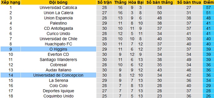 Trong khi đó Universidad Concepción chỉ đang đứng thứ 14 của bảng xếp hạng, chỉ trên nhóm các đội trụ hạng có 3 bậc. Với 36 điểm sau 30 vòng đấu, Universidad Concepción đang có nhiều hơn các đội trong nhóm xuống hạng tới 8 điểm nên không quá lo lắng cho cuộc chiến trụ hạng.